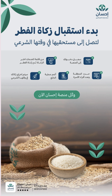 منصة "إحسان" تُتيح خدمة إخراج زكاة الفطر عبر تطبيق وموقع المنصة لإيصالها لمستحقيها في الوقت المحدّد شرعًا