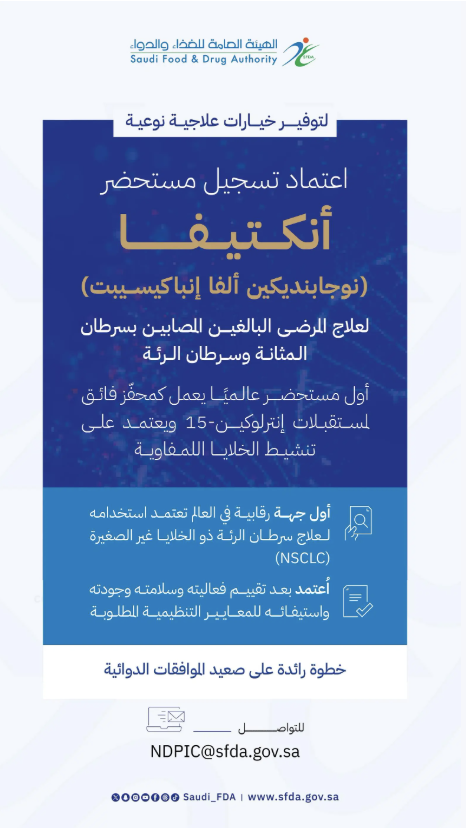 "الغذاء والدواء" تعتمد تسجيل مستحضر "أنكتيفا" لعلاج مرضى سرطان المثانة وسرطان الرئة