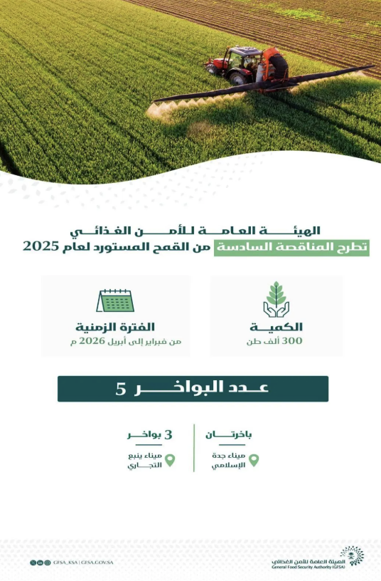 الهيئة العامة للأمن الغذائي تطرح المناقصة السادسة لهذا العام لاستيراد 300 ألف طن قمح