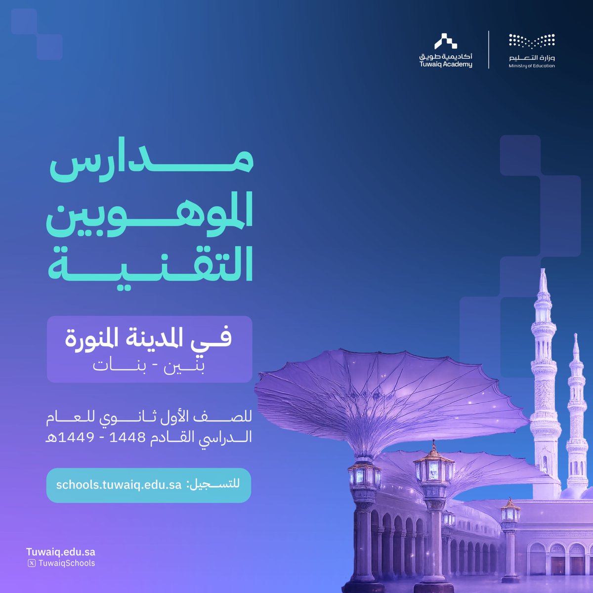 مدارس الموهوبين التقنية بالمدينة المنورة تفتح التسجيل للصف الأول الثانوي للعام 1448 - 1449هـ