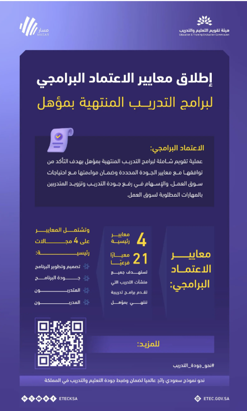 هيئة تقويم التعليم والتدريب تطلق نماذج ومعايير الاعتماد البرامجي لبرامج التدريب المنتهية بمؤهل