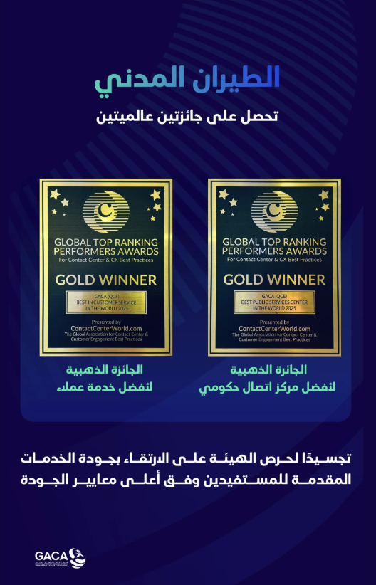 هيئة الطيران المدني تحصد جائزتين ذهبيتين "أفضل مركز اتصال حكومي" و"أفضل خدمة عملاء" على مستوى العالم