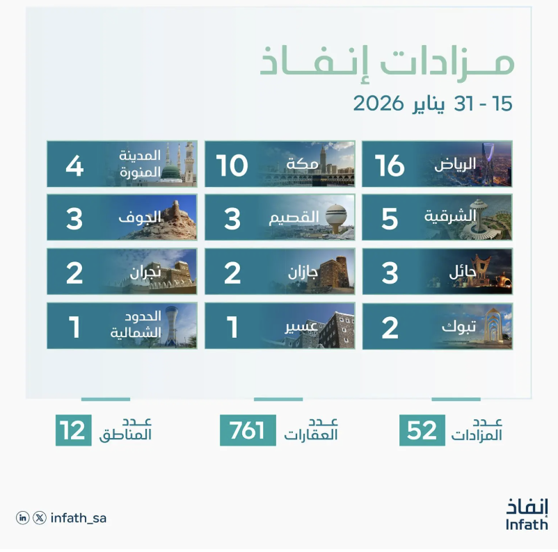 "إنفاذ" يشرف على 52 مزادًا عقاريًا لتصفية وبيع أكثر من 700 عقار
