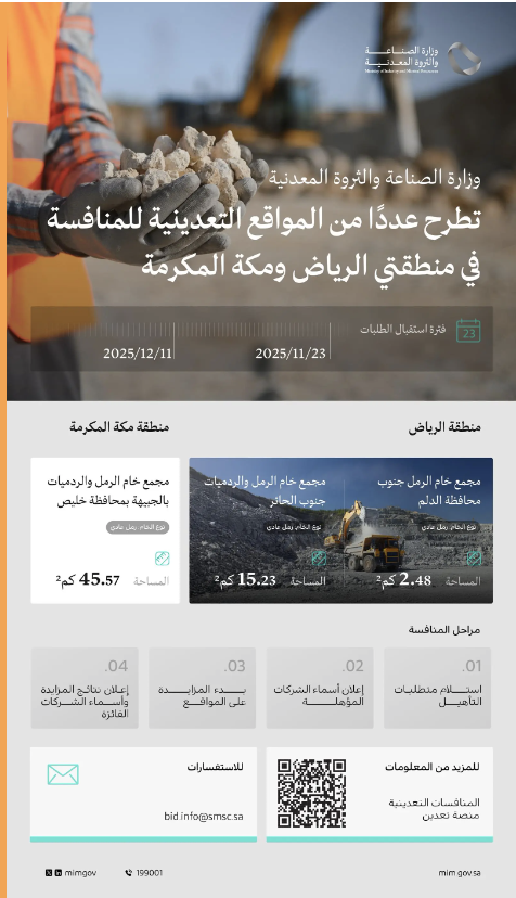 وزارة الصناعة والثروة المعدنية تطرح مجمعات تعدينية للمنافسة في الرياض ومكة المكرمة