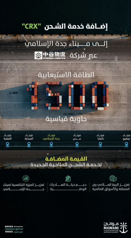 "موانئ": إضافة خدمة الشحن CRX التابعة لشركة Zhonggu Logistics إلى ميناء جدة الإسلامي
