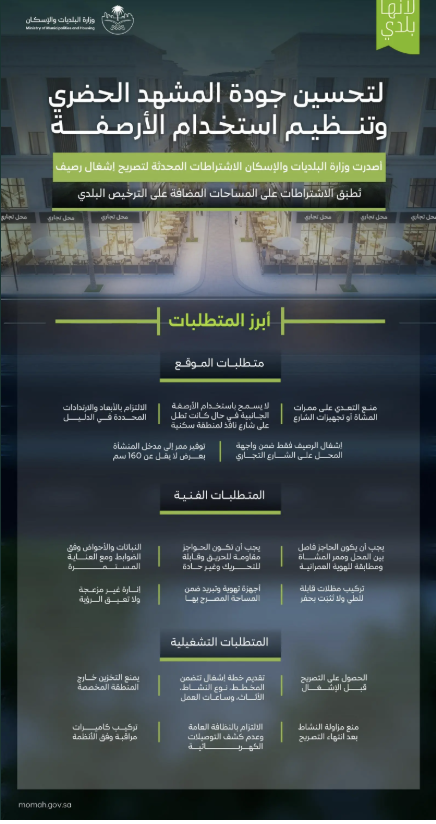 وزارة البلديات والإسكان تعتمد اشتراطات إشغال الأرصفة وتنظيم الأنشطة التجارية