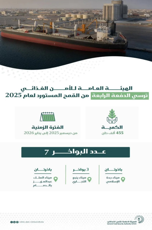 الهيئة العامة للأمن الغذائي ترسي الدفعة الرابعة من القمح المستورد هذا العام