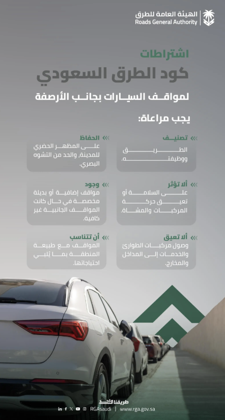"هيئة الطرق": كود الطرق السعودي يحدد اشتراطات مواقف السيارات الجانبية